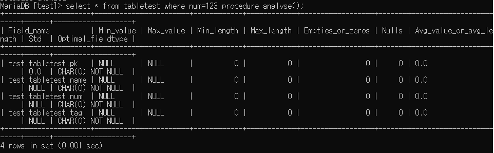 procedure analyse()는 해당 테이블을 분석하여 결과값을 가져오는 명령입니다.